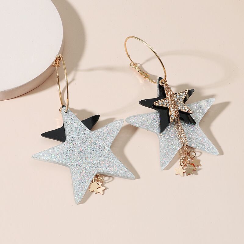 フープピアスに星のチャームをデコレーションしたピアスです。星の3連チャーム+ゴールドチェーンにも小さなスターチャームがついた、星がいっぱいのインパクトのあるデザインです。シンプルなコーディネートもぐっとセンスアップする、ゴージャスでポップな個性派ピアスです。