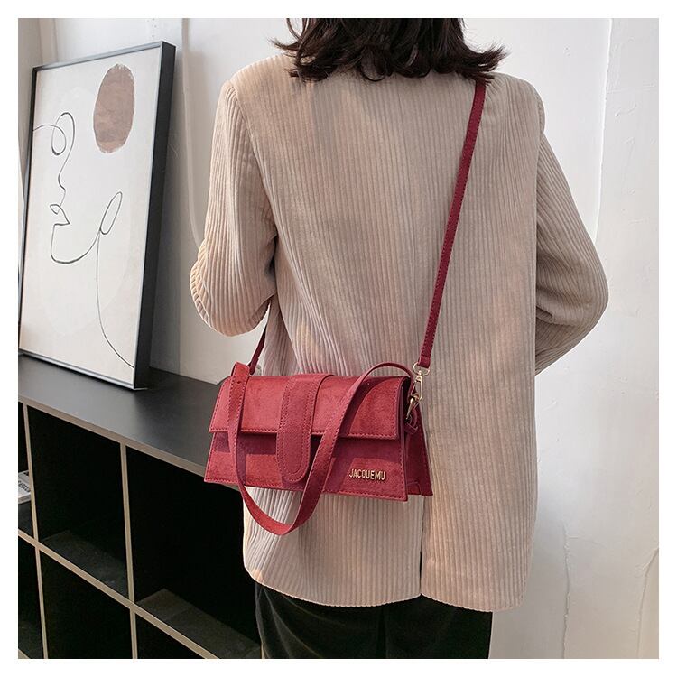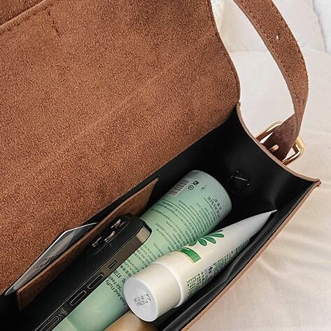 エコスウェードのショルダーバッグです。台形のシルエットがシャープなスタイルに仕上げます。サイドのメタルロゴがアクセント。取り外し可能なショルダーストラップをつければ、肩がけができます。マチも広く、すっきりと荷物を収納できます。
