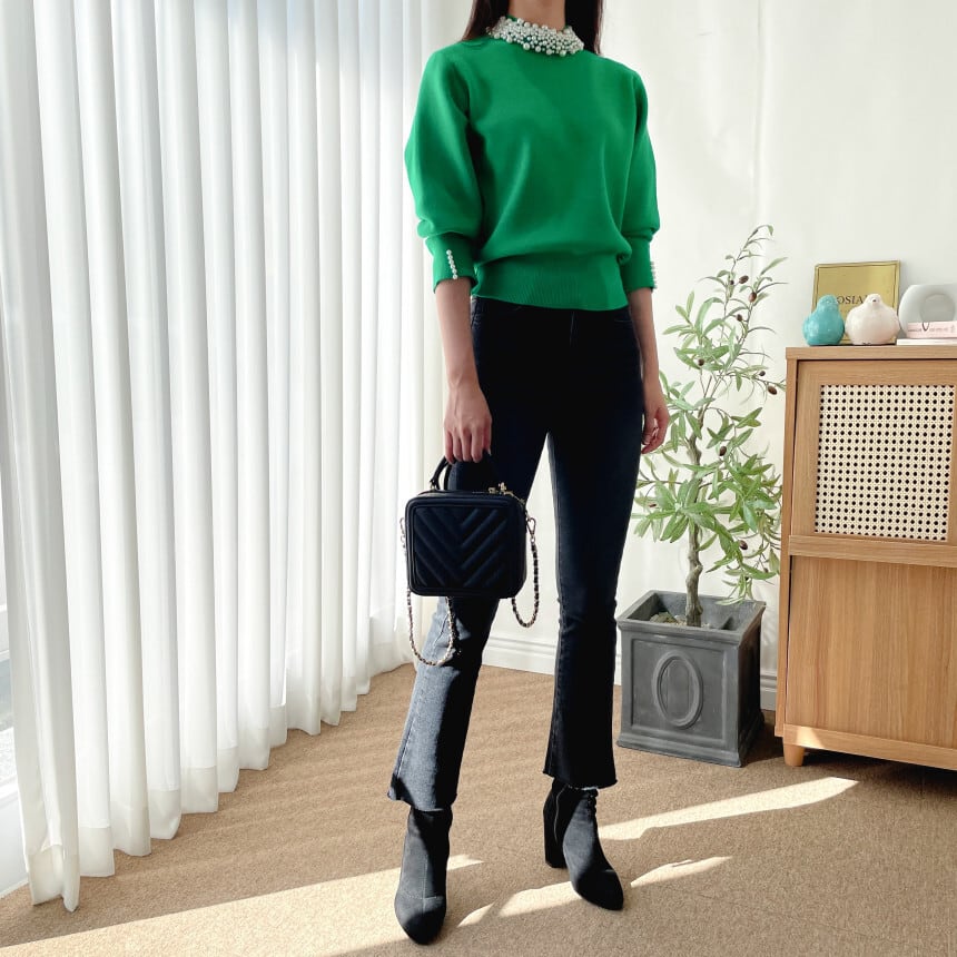 首元のパールデコレーションがエレガントなニットセーターです。袖口にもパールがアレンジされており、フェミニンな雰囲気に仕上がります。パンツでも、スカートでもお手持ちのボトムスとスタイリングしやすいシンプルなデザインです。