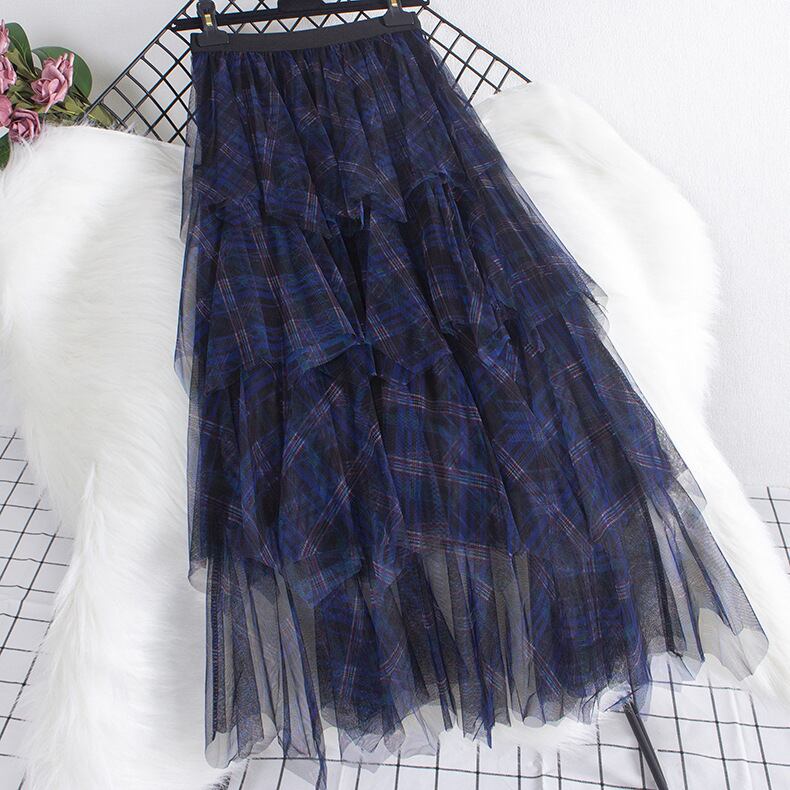 チェックミックス チュールフリルスカート ブルー SK00114
