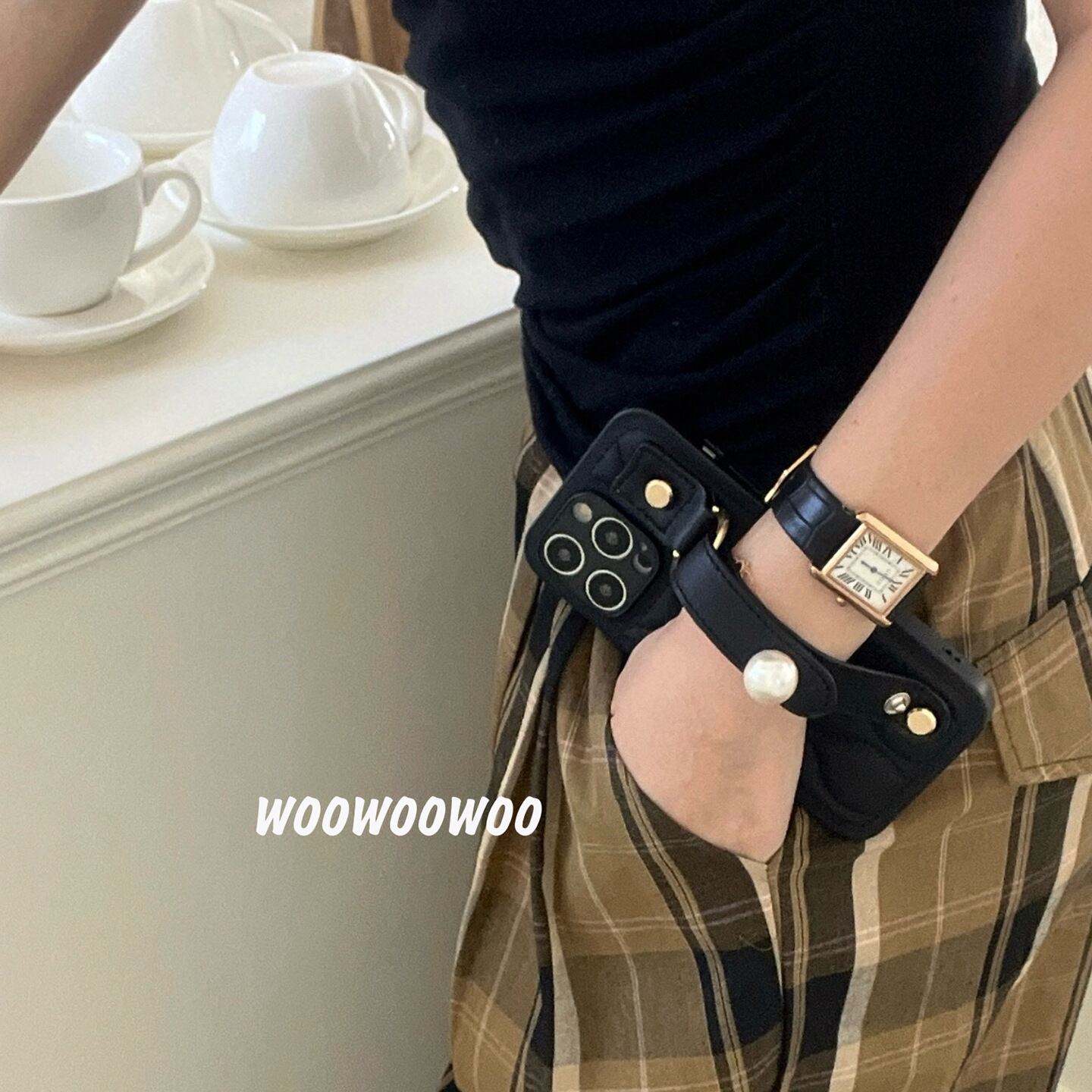 リストバンドのついたキルティングがポイントのiPhoneケースです。ウェーブラインのキルティングとバンドについたパールのチャームがフェミニンなデザインです。レザー調のリストバンドについた2個のボタンでバンドの長さを調整できます。