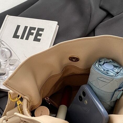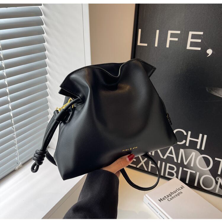 巾着型のデザインがスタイリッシュなショルダーバッグです。取り外しのできるショルダーストラップを外して、ハンドバッグとして2WAYにお使いいただけます。マチも広く、見た目よりも荷物をすっきり収納できます。