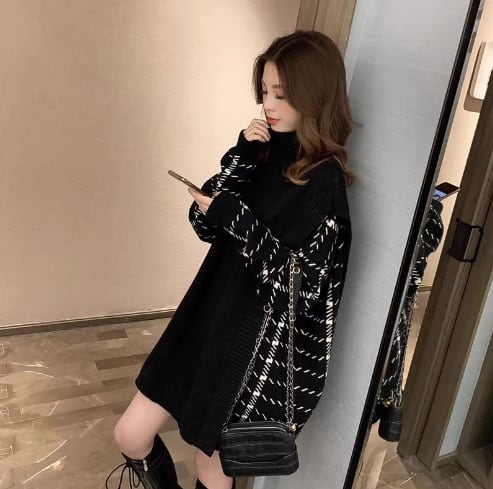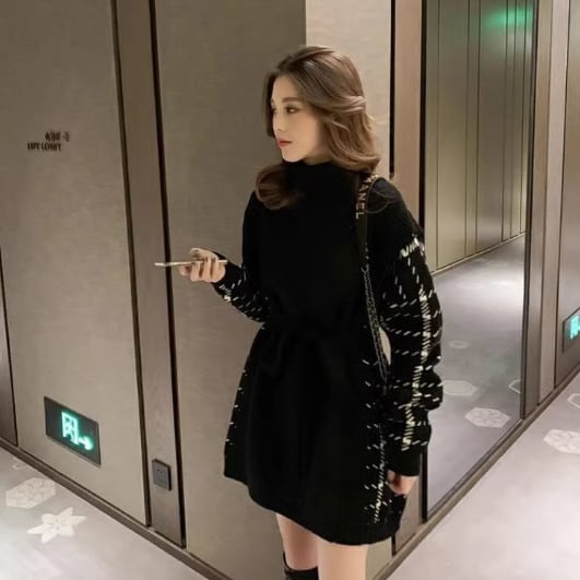 デザインブロッキング ロングニット・ニットワンピース ブラック NI00180
