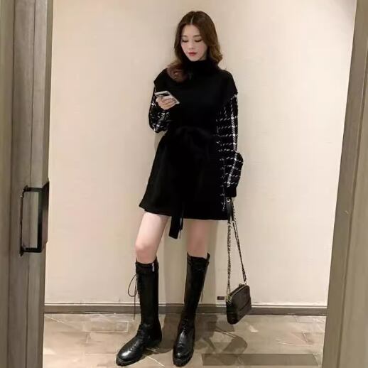 無地とチェックの切替がスタイリッシュなニットワンピースです。ロングニットとしてもお使いいただけます。ゆったりとして、着心地のよいニットです。シルエットをアレンジできる、共布のウエストベルト付きです。