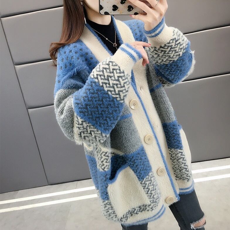 パターンミックス ロングニットカーディガン ブルー NI00171