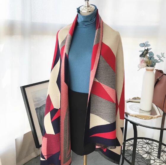 ヴィヴィッドなジオメトリック柄のストールです。秋冬のコーディネートのアクセントにおすすめです。オフィスや旅行先でのひざ掛けとしてもお使いいただけます。