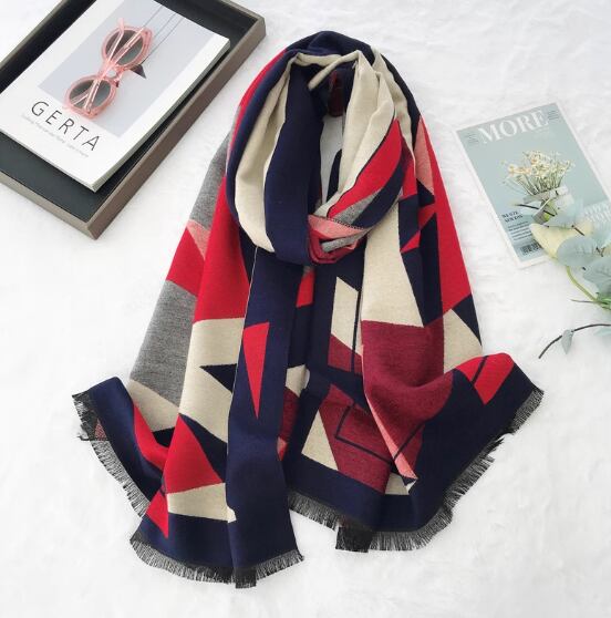 ジオメトリックストール ワイドマフラー ワイン/ネイビー WT00006