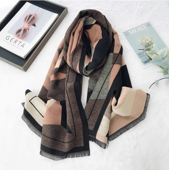 ヴィヴィッドなジオメトリック柄のストールです。秋冬のコーディネートのアクセントにおすすめです。オフィスや旅行先でのひざ掛けとしてもお使いいただけます。