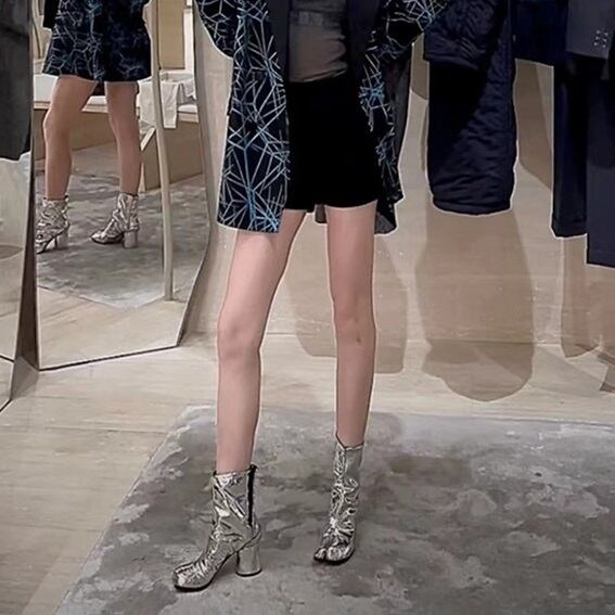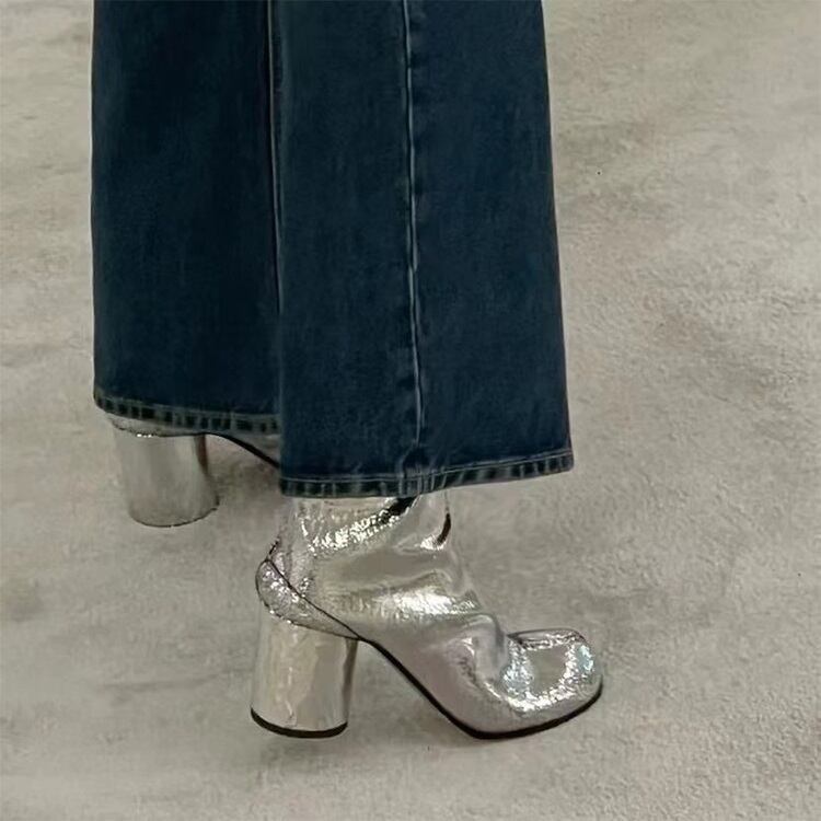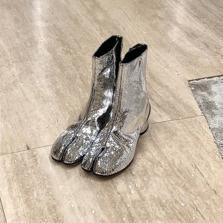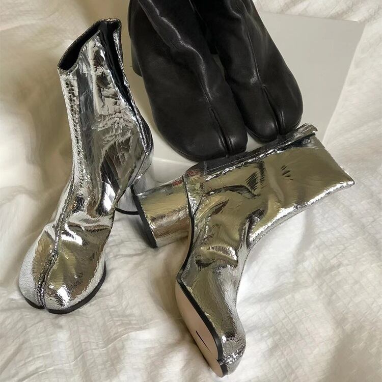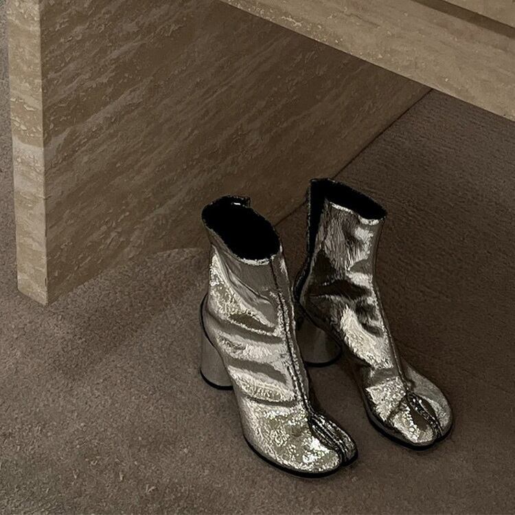 メタリックシルバーがユニークなリアルレザーのタビブーツです。個性的な足袋のようなトゥと円柱型ヒールがポイントです。パンツでも、スカートでもフレッシュな印象に仕上がります。スタイリングが楽しくなる、おすすめのセンスアップアイテムです。