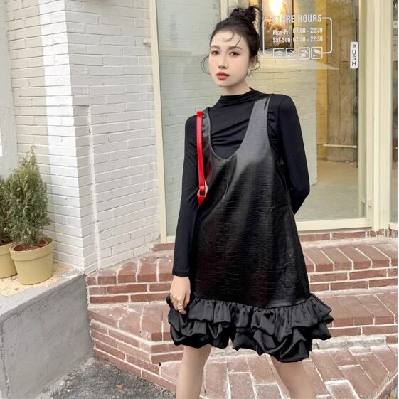 エコレザー コンビネーションフリルジャンパースカート ブラック OP00172