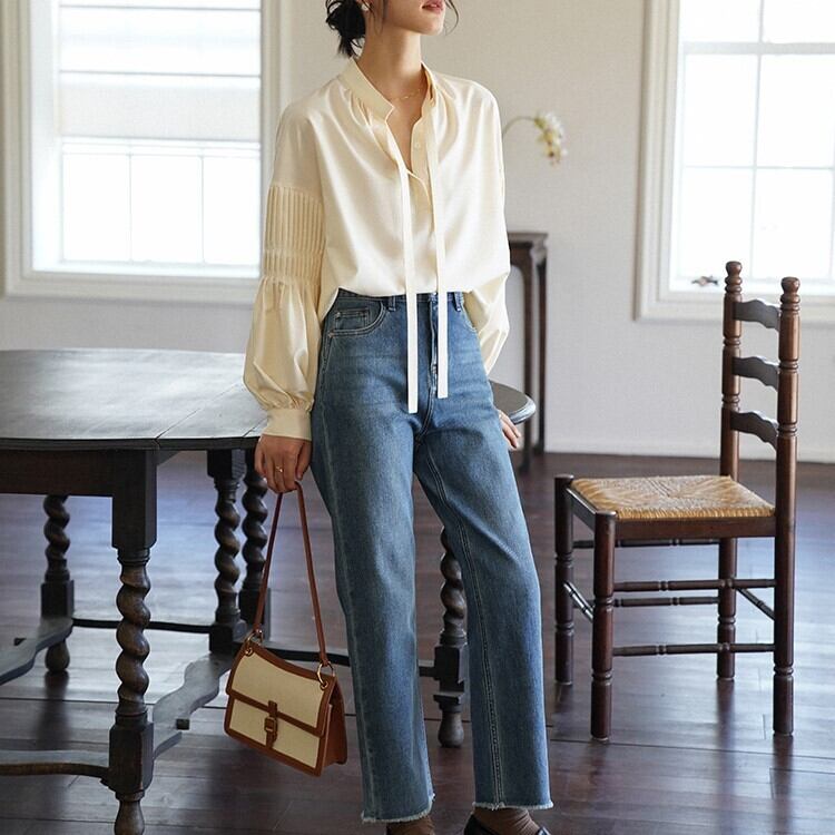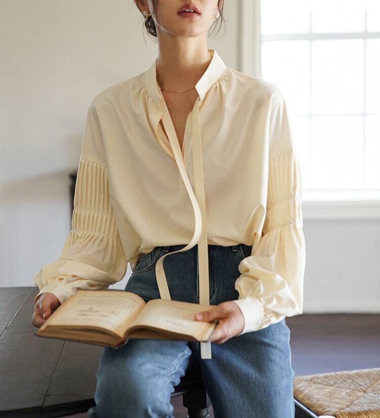 リボンタイと袖のプリーツがポイントのブラウスです。スタンドカラーで首元もすっきりとまとまります。ボトムスを選ばない便利なショート丈です。ジャケットのインナーとしてもおすすめです。