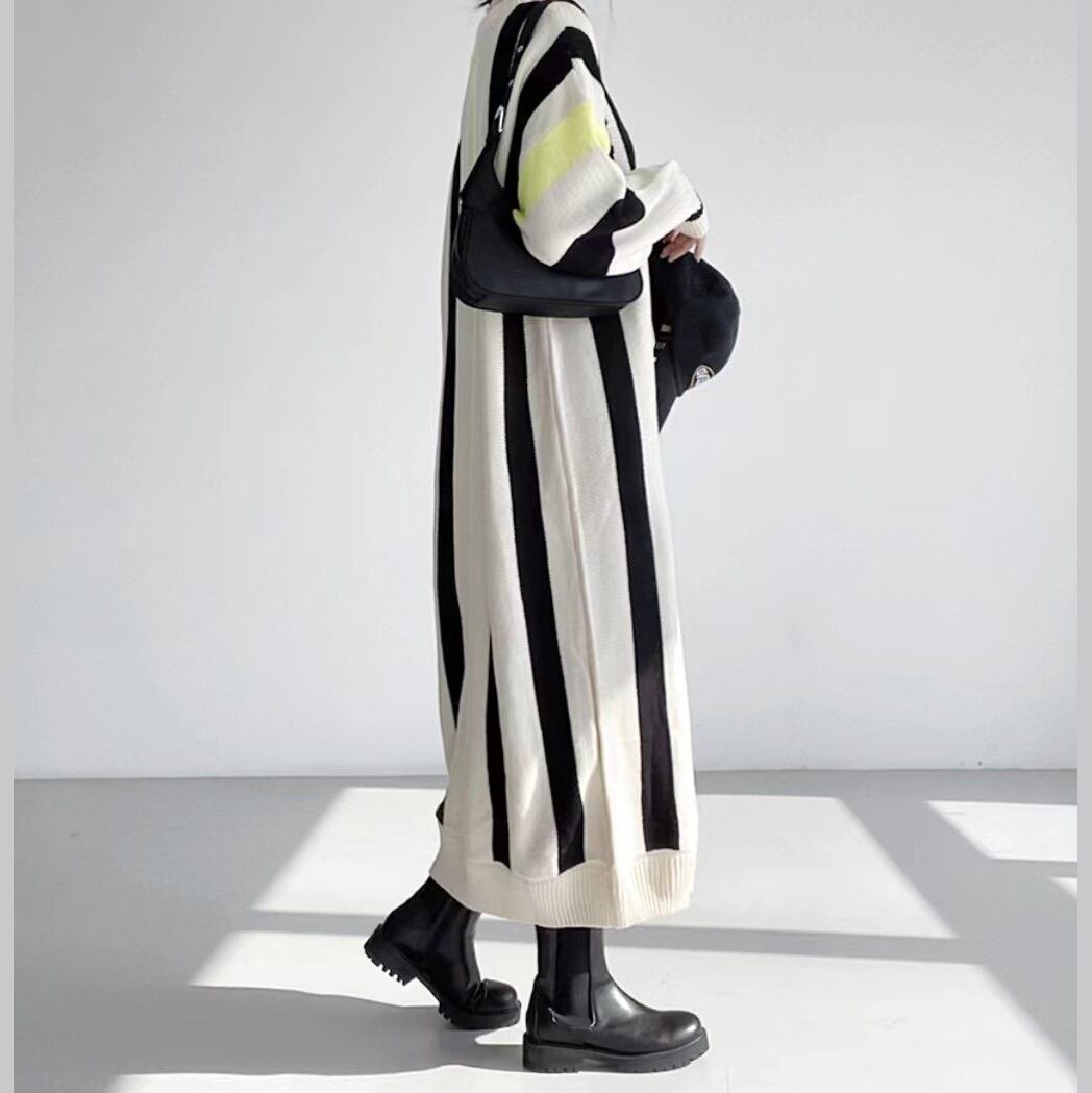 マルチカラーストライプがスタイリッシュなニットワンピースです。春秋冬の3シーズンを通してニットやシャツを重ねたり、スカート、パンツやタイツでレイヤードスタイルが楽しめます。幅広いサイズに対応する、ゆったりサイズです。ストライプの縦のラインでスタイルアップも叶います◎