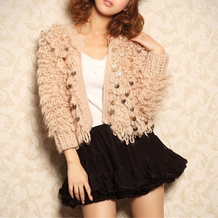 ループヤーンにスパンコールをアレンジしたニットカーディガンです。ループヤーンならではのふんわりした質感と、ソフトなカラーリングがポイントです。いつものカーディガンと同じように羽織るだけで、ハイセンスなスタイルにかわります。3シーズン使える便利なアイテムです。