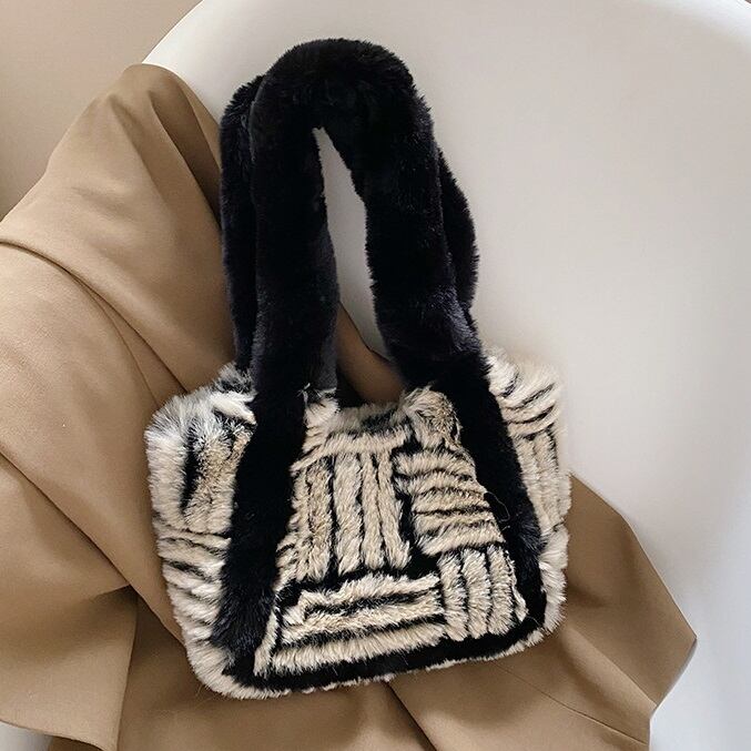 ジオメトリック柄とブラックのストラップ+ライニングがポイントのエコファートートバッグです。マチが広く、見た目よりも荷物をすっきり収納できます。ストラップもモコモコのエコファーで温かく、ソフトな質感に癒されます。秋冬のコーデのアクセントにしたいスタイリッシュなバッグです。
