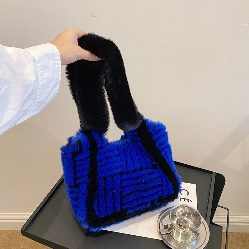 ジオメトリック柄とブラックのストラップ+ライニングがポイントのエコファートートバッグです。マチが広く、見た目よりも荷物をすっきり収納できます。ストラップもモコモコのエコファーで温かく、ソフトな質感に癒されます。秋冬のコーデのアクセントにしたいスタイリッシュなバッグです。