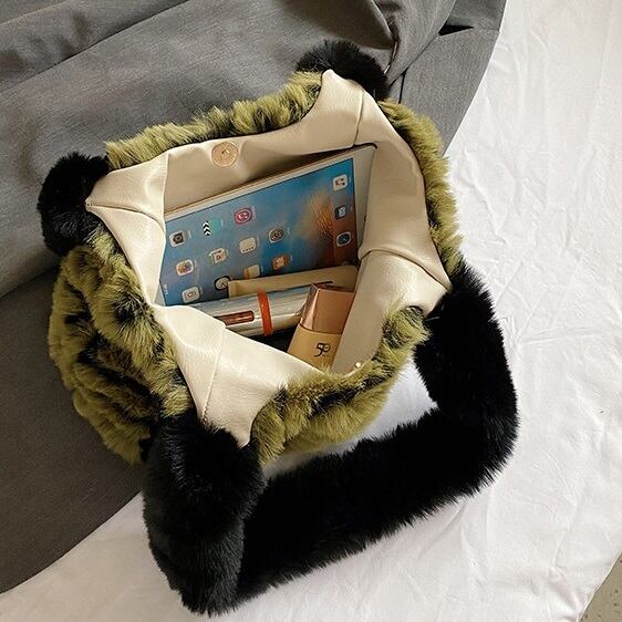 ジオメトリック柄とブラックのストラップ+ライニングがポイントのエコファートートバッグです。マチが広く、見た目よりも荷物をすっきり収納できます。ストラップもモコモコのエコファーで温かく、ソフトな質感に癒されます。秋冬のコーデのアクセントにしたいスタイリッシュなバッグです。