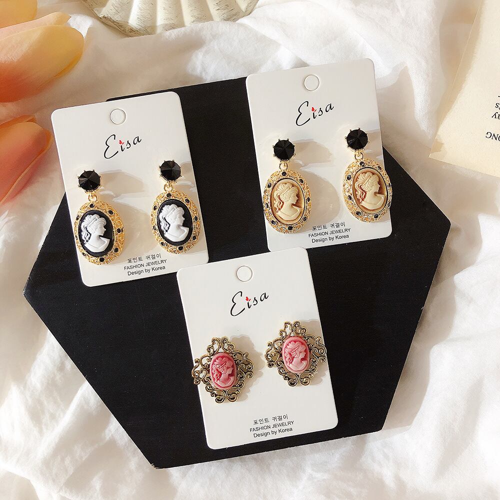 カメオをパヴェクリスタルでデコレーションした、エレガントなピアスです。アンティークのような美しいチャームがアクセント。スタッズのブラックが入ることで、ゴージャスになりすぎず落ち着いた雰囲気に仕上がります。シンプルなスタイリングに合わせたい、主役級アイテムです。