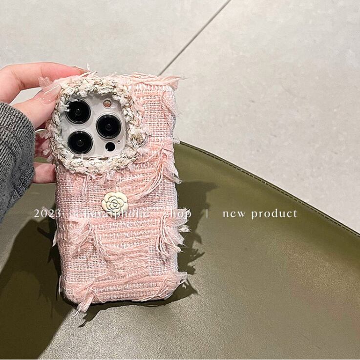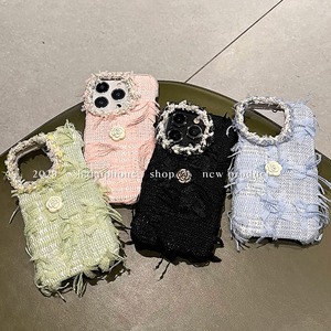 リボンが編み込まれたシャギーツイードをアレンジしたiPhoneケースです。カメラのレンズまわりのステッチとフロントについたカメリアチャームがポイントです。手に取るたびに気分が上がる、エレガント、かつスタイリッシュなデザインです。ロマンティックなイメージのペールピンク、ペールグリーン、ペールブルー、そしてブラックの4色展開です。
