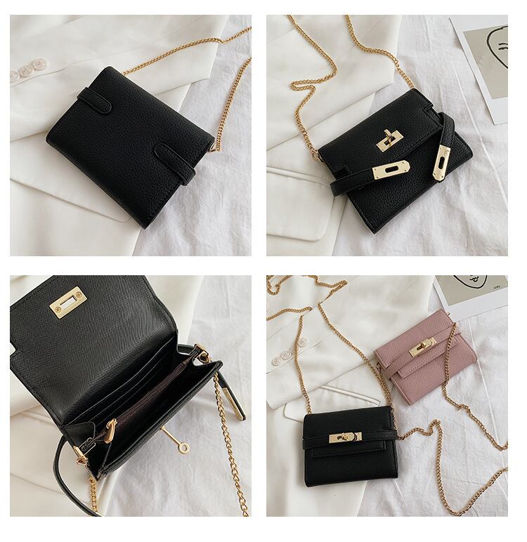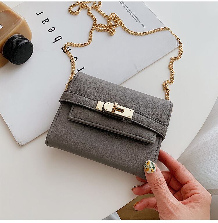 ゴールドの金具がポイントのストラップベルトデザインのチェーンウォレットです。着脱のできるゴールドのチェーンをつけて肩がけができます。ちょっとしたお買い物や、荷物を少なくしたいお出かけにぴったりのチェーンウォレットです。軽くてお手入れのしやすいエコレザーで、セカンドウォレットにもおすすめです。