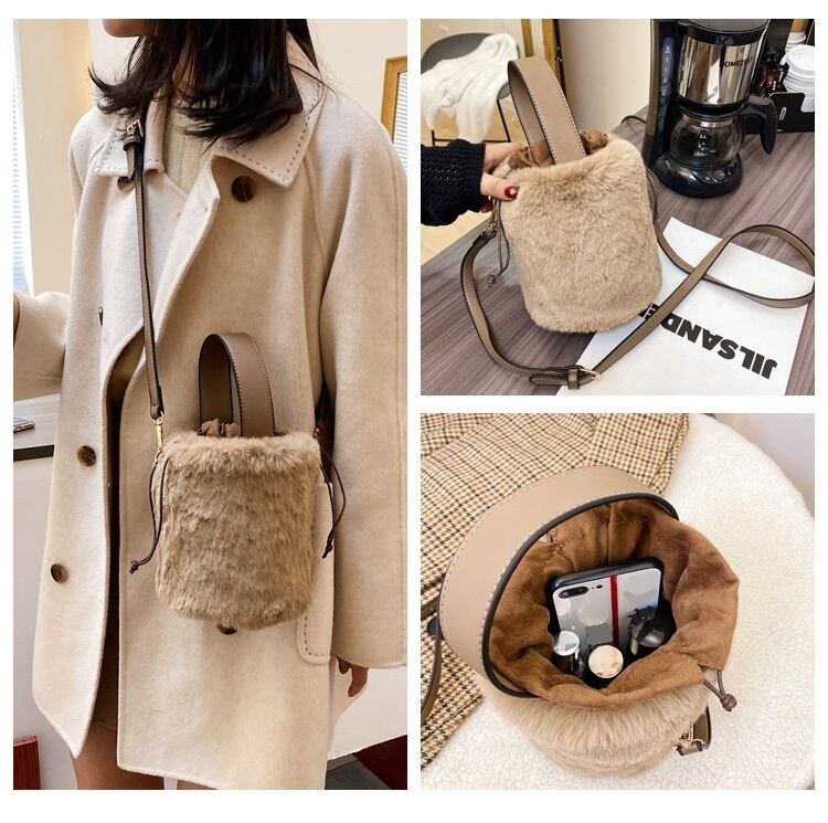 エコファーのバケットバッグです。エコファーの質感とコロンとしたキュートなフォルムに幅の広いストラップがアクセントになっています。取り外し可能なショルダーストラップ付きで肩掛けもできます。ストリングで開閉ができるので、安心して荷物を携帯できます。