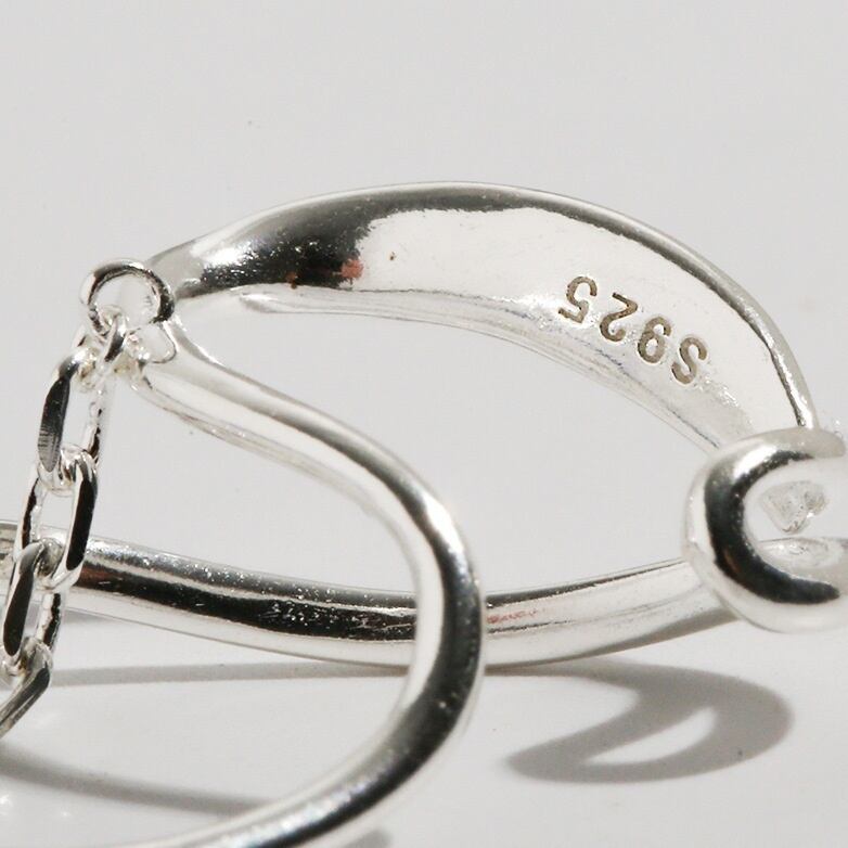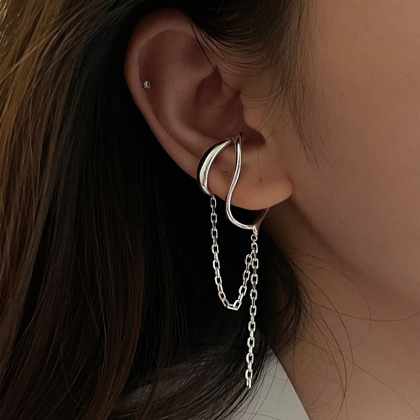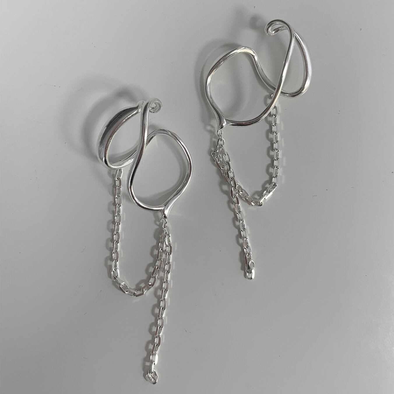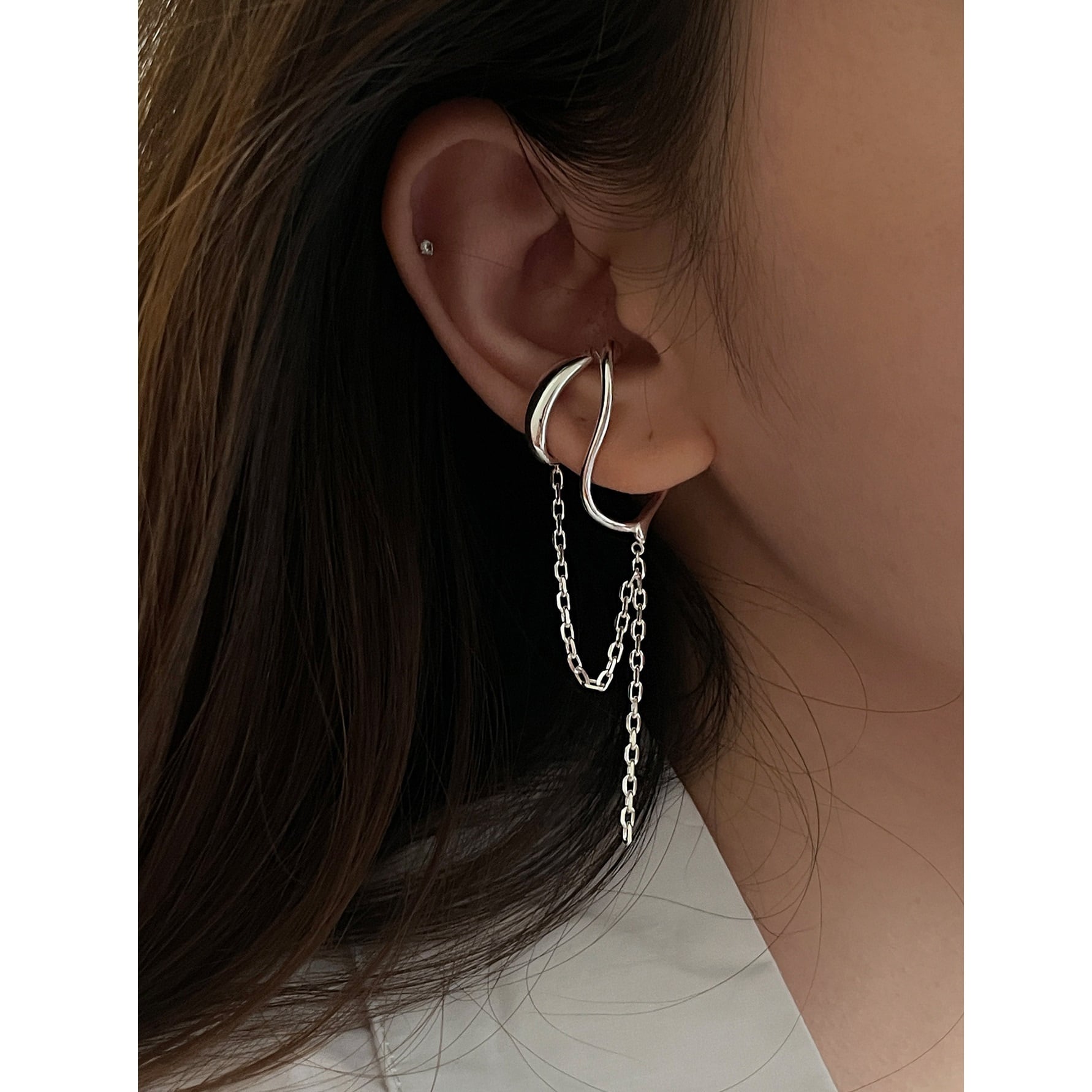 シルバーチェーンでイヤーカフをデコレーションしたユニークなデザインです。チェーンの動きが楽しめる繊細なデザインがコーディネートを引き立てます。耳に掛けるタイプのイヤーカフ・イヤークリップタイプですので、ピアスホールのない方でもお使いいただけます。