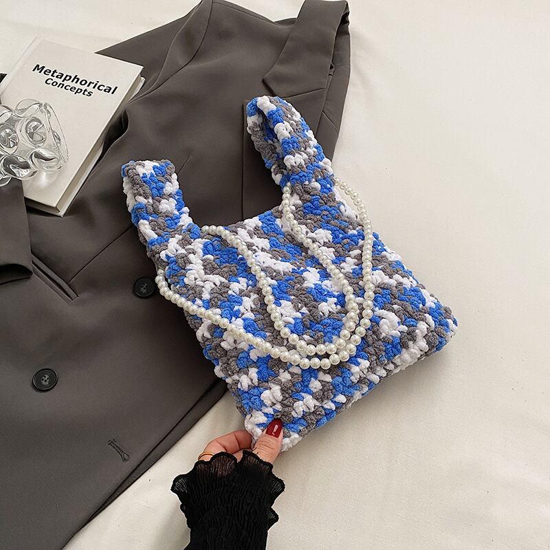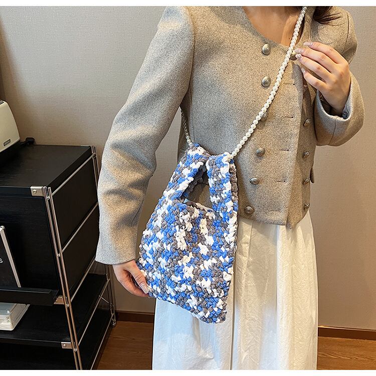 ポップなカラーリングのモールニットを使用したハンドバッグです。パールのショルダーストラップを付ければポシェットとして、パールストラップを2連にして肩がけしてショルダーバッグとしてお使いいただけます。ハンドバッグ、ショルダーバッグ、ポシェットと3通りの使い方ができる便利なバッグです。コーデのアクセントにおすすめの、マルチミックス、ブルーミックス、グレーミックスの3色展開です。