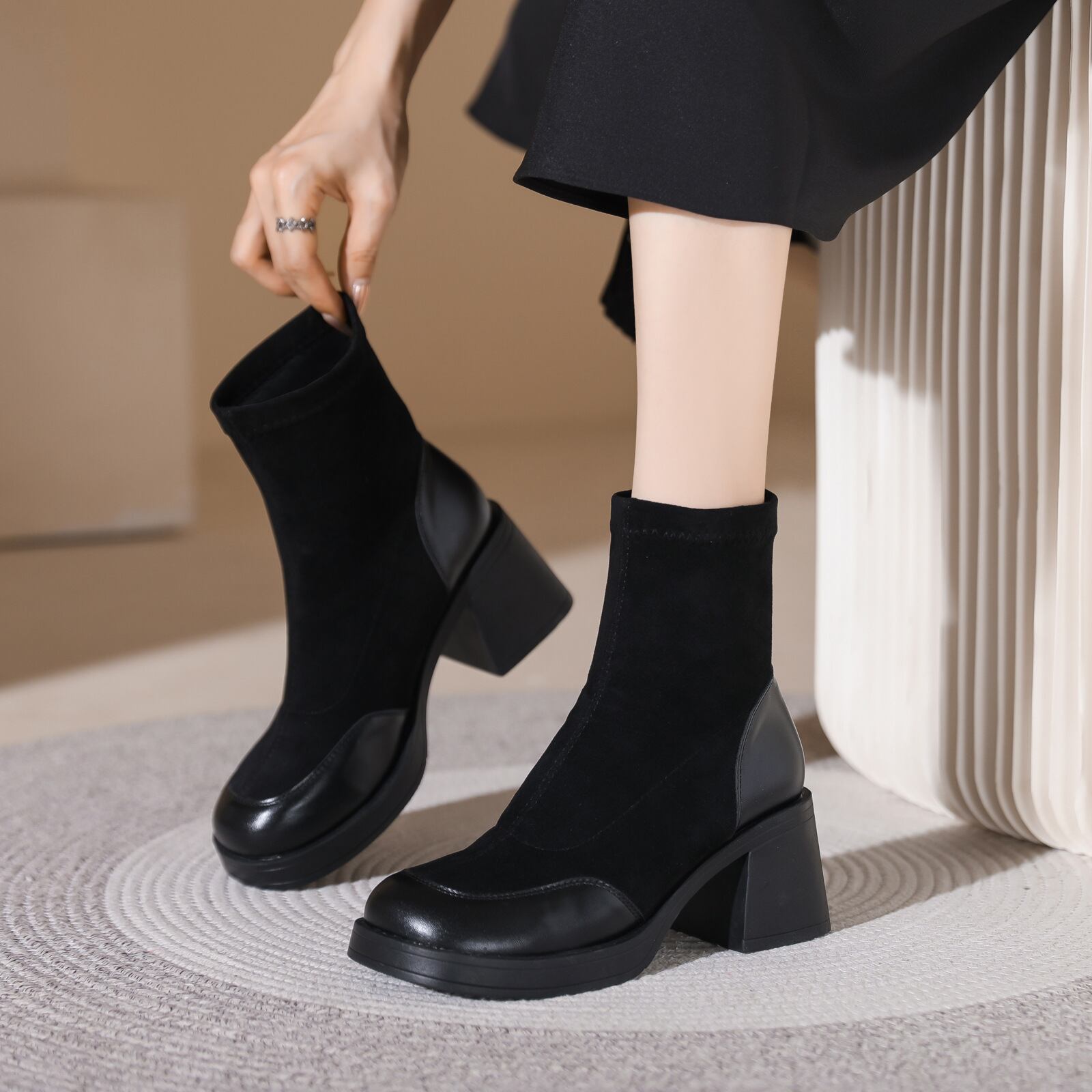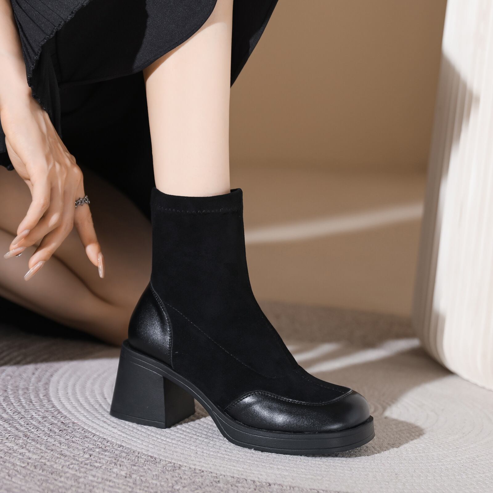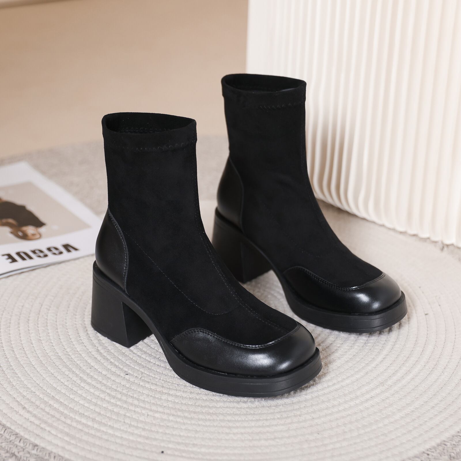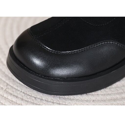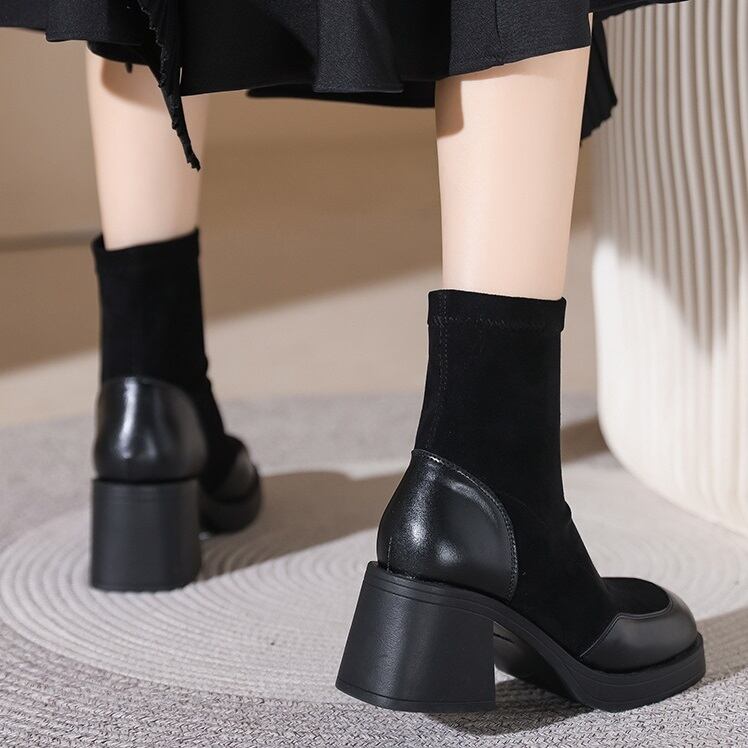 エコレザーコンビ ブロックヒール ショートブーツ ブラック BU00034