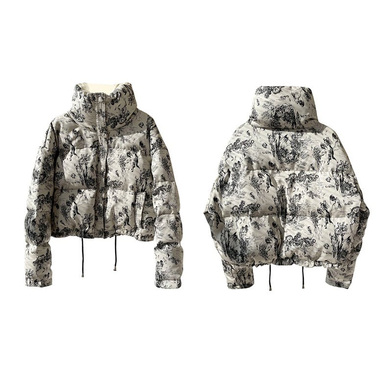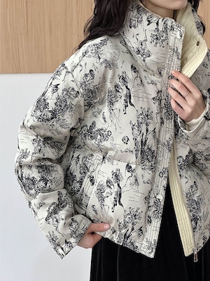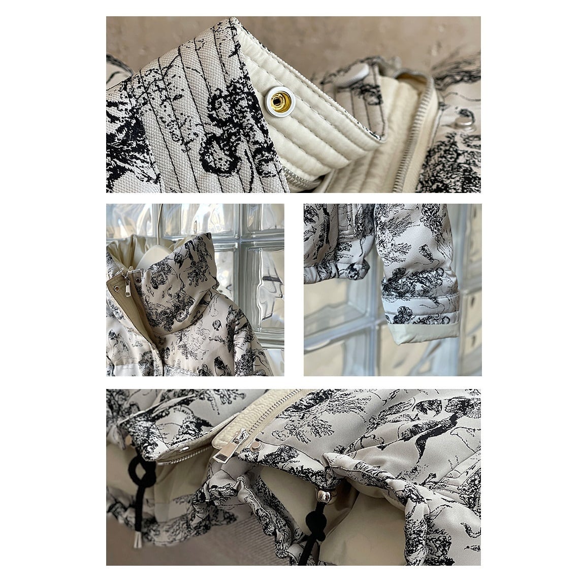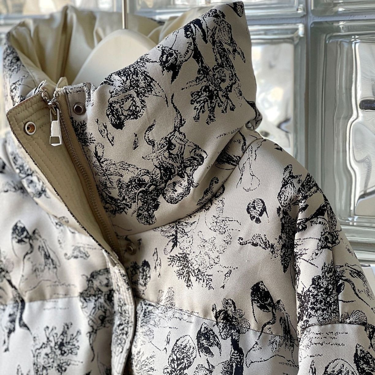 ユニークなインクペインティングをプリントしたショートダウンジャケットです。しっかりとした縫製で、首まわりや袖口から冷気を入れず、防寒面も◎です。ダークカラーが多くなりがちな季節に映えるホワイトも魅力です。ボタンやファスナーなども高級感のある仕上がりです。インポートアイテムならではのユニークでラグジュアリーなダウンジャケットです。