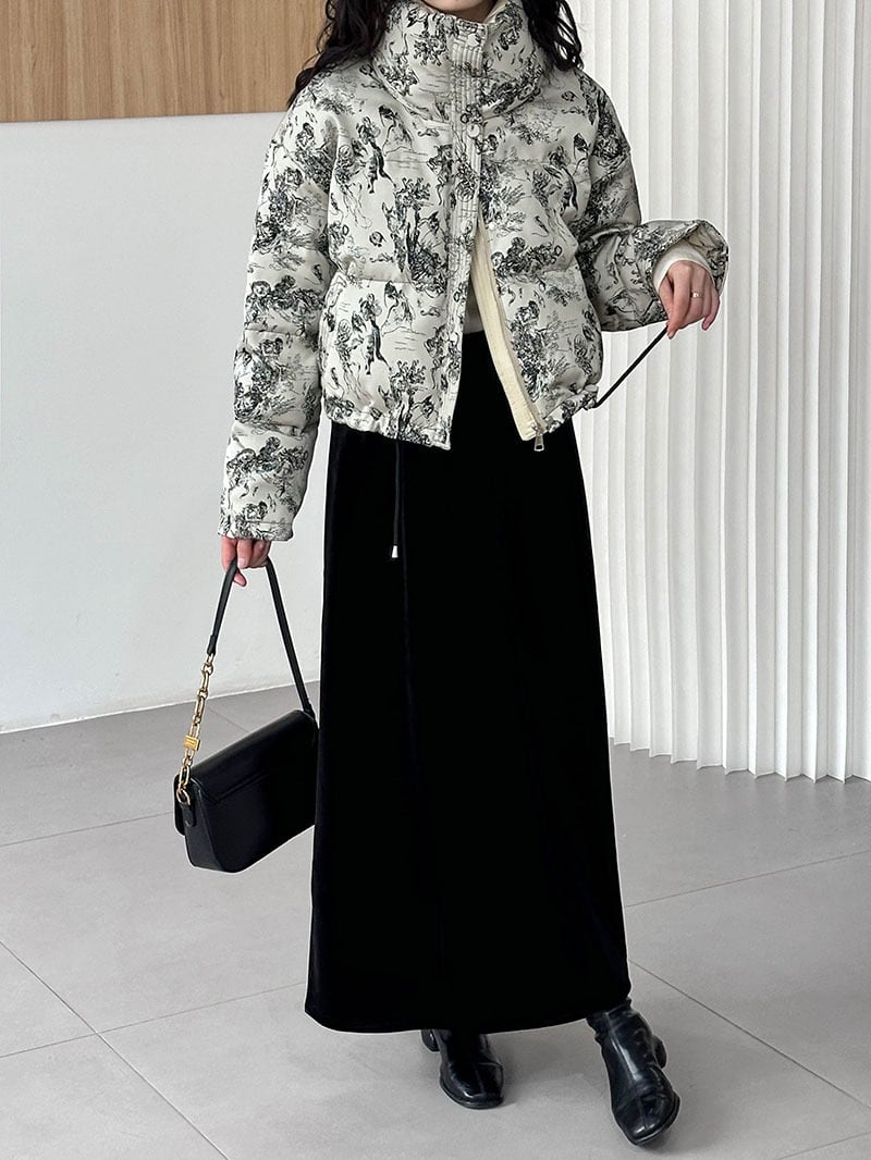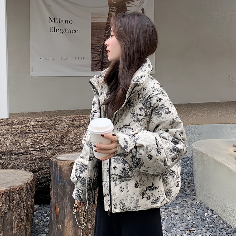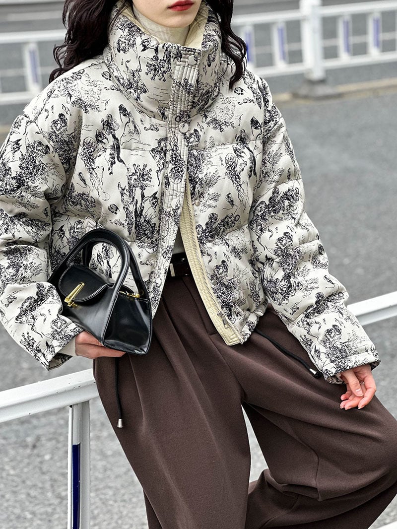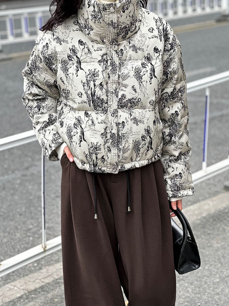 ユニークなインクペインティングをプリントしたショートダウンジャケットです。しっかりとした縫製で、首まわりや袖口から冷気を入れず、防寒面も◎です。ダークカラーが多くなりがちな季節に映えるホワイトも魅力です。ボタンやファスナーなども高級感のある仕上がりです。インポートアイテムならではのユニークでラグジュアリーなダウンジャケットです。