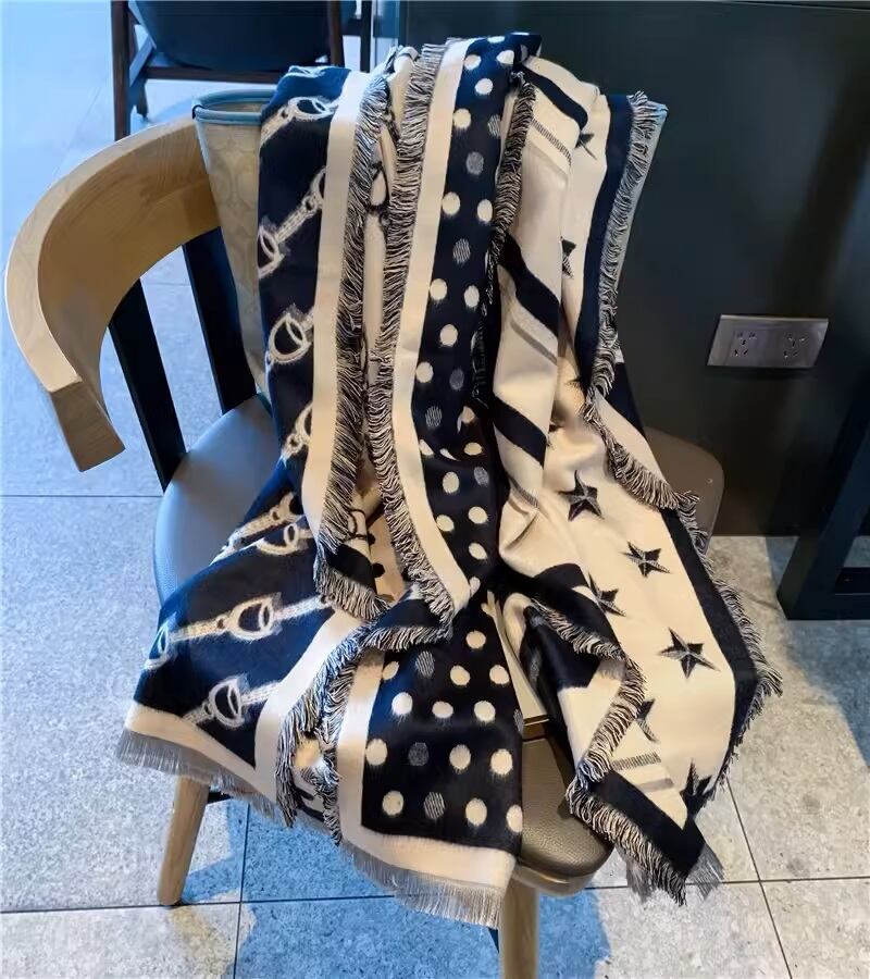 4パターン(スター/ホースビット/ドット/ストライプ)の柄が入ったワイドマフラー・ストールです。表面はブラックがメインの柄、裏地はアイボリーがベースの柄、巻き方や柄の出し方によって雰囲気がかわり、スタイルに合わせてアレンジが楽しめます。少し肌寒い時に首に巻いたり、羽織ったり、ひざ掛けとしてもお使いいただけます。空調の強いオフィスや旅行先に1枚あると便利なアイテムです。