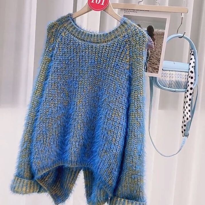 バイカラーがフレッシュなニットセーターです。特殊な編み方で布地が2色に見えるユニークなデザインです。同色のタートルネックのタイプ「バイカラー リブタートルニット ブルー NI00093」もございます。