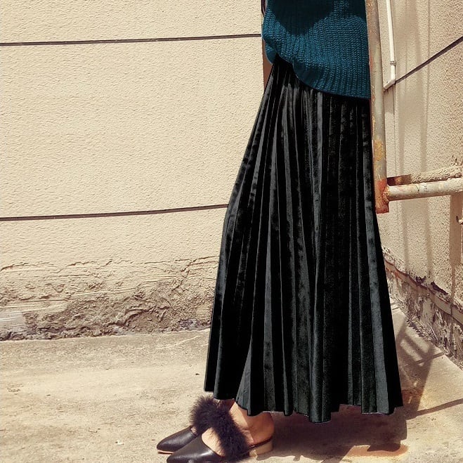 ラグジュアリー感のあるベルベットのロングプリーツスカートです。美しいベルベットの光沢と独特のカラーリング、ボリュームのあるロングプリーツでエレガントなコーディネートが完成します。幅広いトップスとスタイリングが楽しめる便利なロングスカートです。