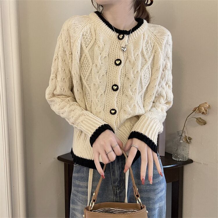 ブラックのトリミングとハートのボタンで普通のケーブルニットカーデより格段に可愛いです。