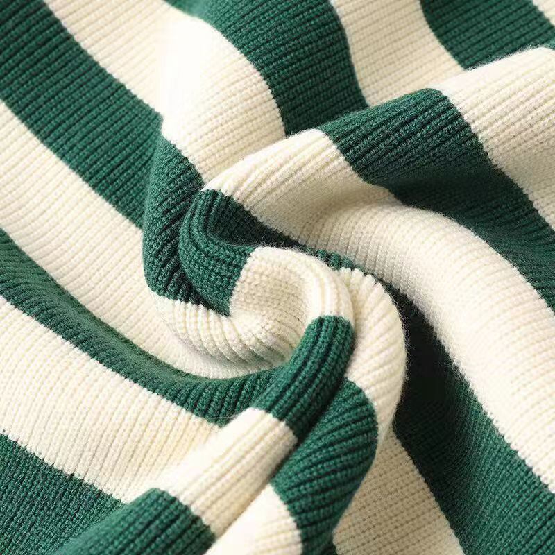 グリーンとアイボリーのボーダーニットです。パフスリーブや袖と裾の長めのリブで、フレッシュな印象に仕上がります。パンツでもスカートでも、3シーズンを通してコーディネートが楽しめます。