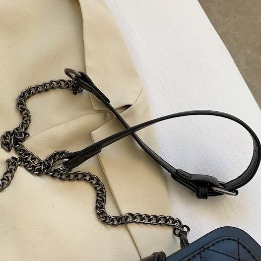 キルティングとブラックのスクエアバックルがクールなチェーンバッグです。チェーンもガンメタルカラーを使用し、深みのあるデザインが魅力です。ポケットも多く、すっきりと荷物を収納できます。ダークグリーン、バーガンディー、ホワイト、ブラックの4色展開です。