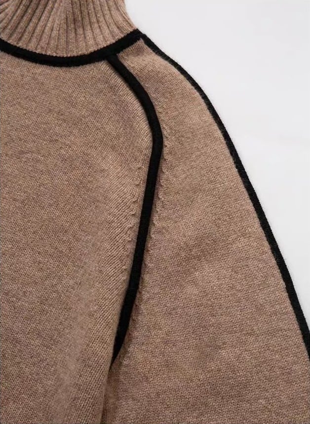 ライニングがポイントのハイネックニットセーターです。袖、首まわり、裾に入ったブラックライニングがシンプルなニットをぐっとセンスアップ。袖と首のリブの太さや、袖のボリュームなど、こだわりのディティールです。シンプルながらセンスが光るデザインです。