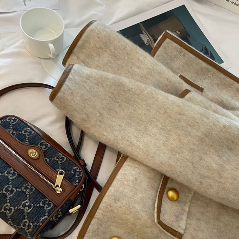ライトグレーにブラウンのトリミングの入ったショートジャケットです。衿と裾、袖口、ポケットに入ったブラウンのトリミングとマットゴールドのボタンがアクセントとなり、エレガントな印象に仕上げてくれます。ノーカラーとショート丈で堅くなりすぎず、デニムなどのカジュアルなアイテムとも合わせやすいデザインです。