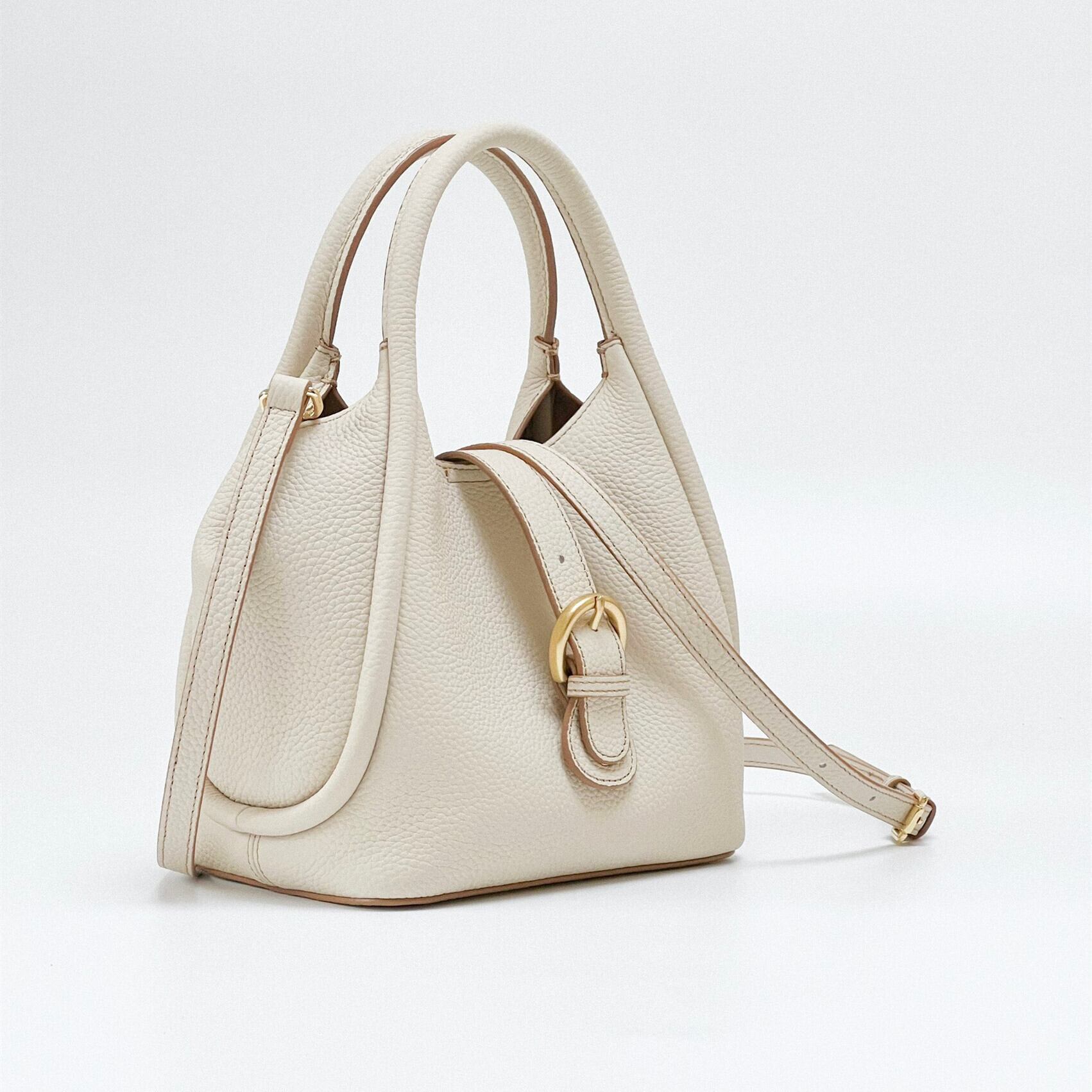上質なぺブルドレザーを使用したバケットバッグです。取り外しが可能なショルダーストラップをつけて、ショルダーバッグとしてもお使いいただけます。マチが広く、すっきりと荷物を収納できます。お仕事用でも、プライベートでも、幅広いスタイルにフィットするエレガントなデザインです。