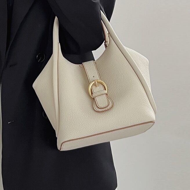 上質なぺブルドレザーを使用したバケットバッグです。取り外しが可能なショルダーストラップをつけて、ショルダーバッグとしてもお使いいただけます。マチが広く、すっきりと荷物を収納できます。お仕事用でも、プライベートでも、幅広いスタイルにフィットするエレガントなデザインです。