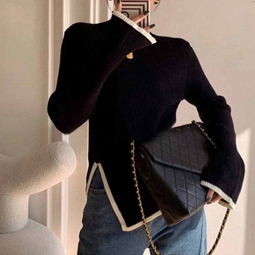前後のアシンメトリーヘムがポイントのリブニットハイネックセーターです。裾と袖口に入ったホワイトがアクセント。細めのリブやアシンメトリーなデザイン、ベルスリーブなど、細部までエレガントなデザインでスタイルアップも叶います。ジャケットなどのインナーとして、ジャンパースカートとレイヤードスタイルを楽しんでも、ユニークなスタイリングが楽しめます。