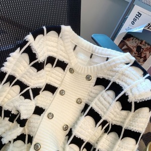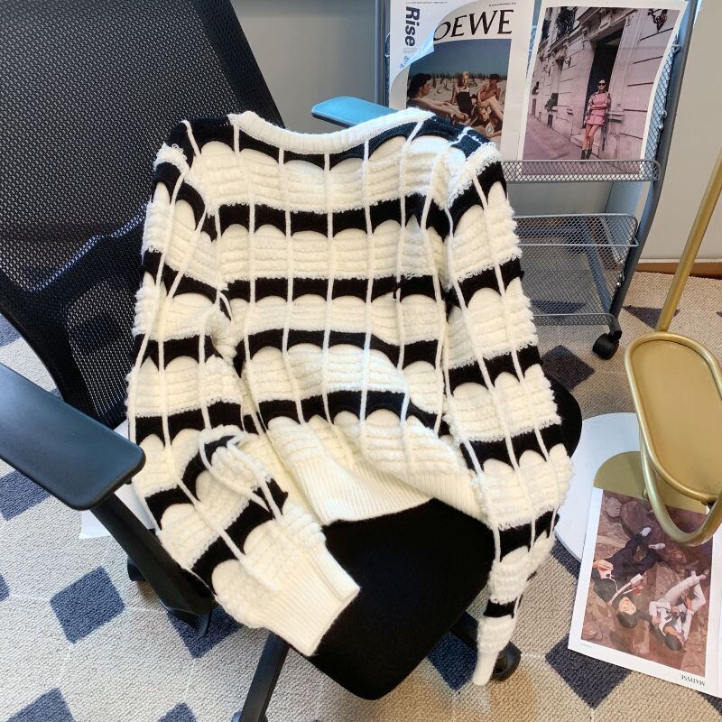 ジオメトリックボーダー ダブルボタン ニットセーター ホワイト/ブラック NI00148