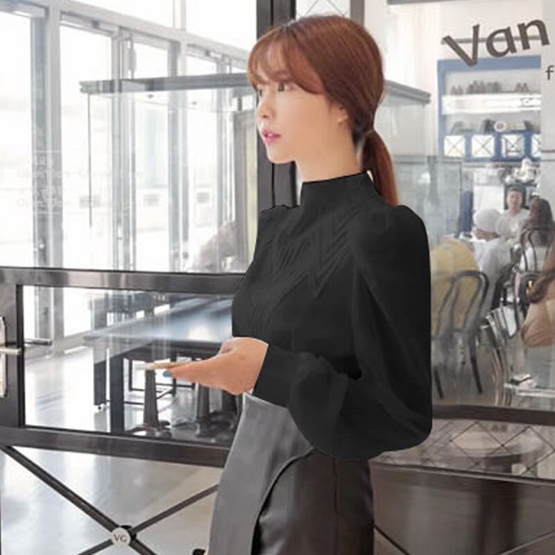 フロントに入ったシェブロンモチーフがポイントのパフスリーブのシフォンブラウスです。かっちりとしたシェブロン柄でスマートな雰囲気+袖はちょうど良いシフォンの透け感で、上品でエレガントなスタイルに仕上がります。スタンドカラーでさらに柔らかさもプラス、女性らしさをプラスしたい時におすすめのブラウスです。