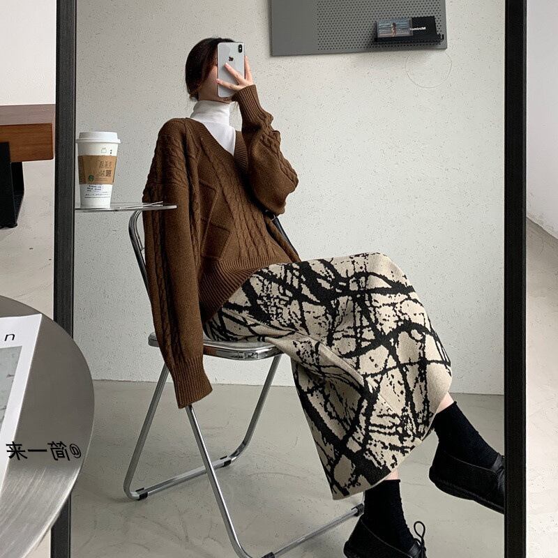 ドリッピングアートのようなデザインのハイセンスなロングスカートです。プリント柄とは違った薄手のニット素材ならではの、柄の面白さが楽しめます。タイトとフレアのちょうど中間くらいのシルエットもポイントです。落ち着いたモノトーンですので、コーディネートに取り入れやすく、アクセントになる使いやすいスカートです。