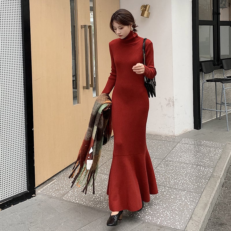 マーメイドライン タートルネック ニットワンピース テラコッタブラウン OP00180