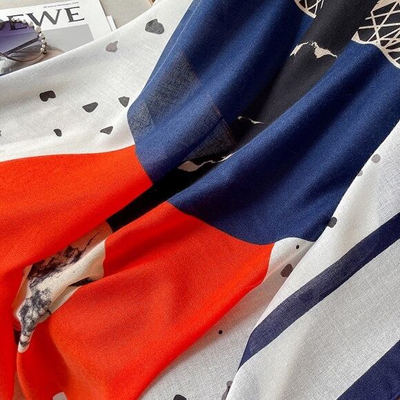 様々なパターンが1枚に入ったワイドマフラー・ストールです。カラーブロック、イレギュラードット、ジオメトリックなど、スタイリッシュなパターンをミックス、巻き方や柄の出し方によって雰囲気がかわり、スタイルに合わせてアレンジが楽しめます。