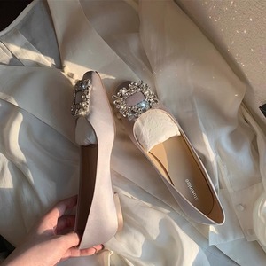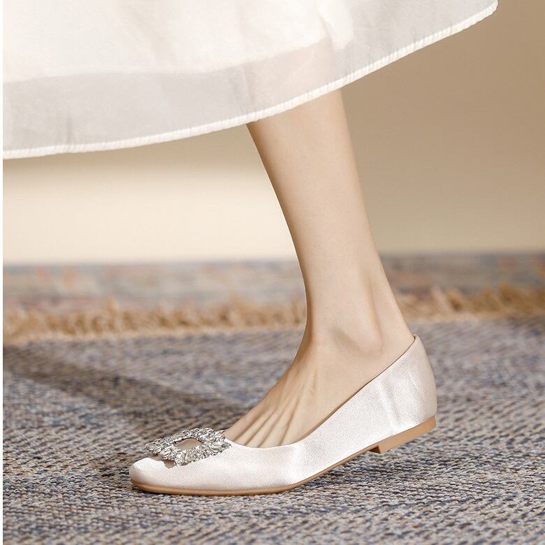 キラキラのスクエアビジューがポイントのフラットパンプスです。クリアのスクエアビジューとサテン地の落ち着いた質感で、どんなスタイルも上品でフェミニンな印象に仕上がります。脚がきれいに見え、歩きやすいフラットソールです。ドレッシーなスタイルはもちろん、カジュアルなデニムスタイルもエレガントな雰囲気に仕上がります。