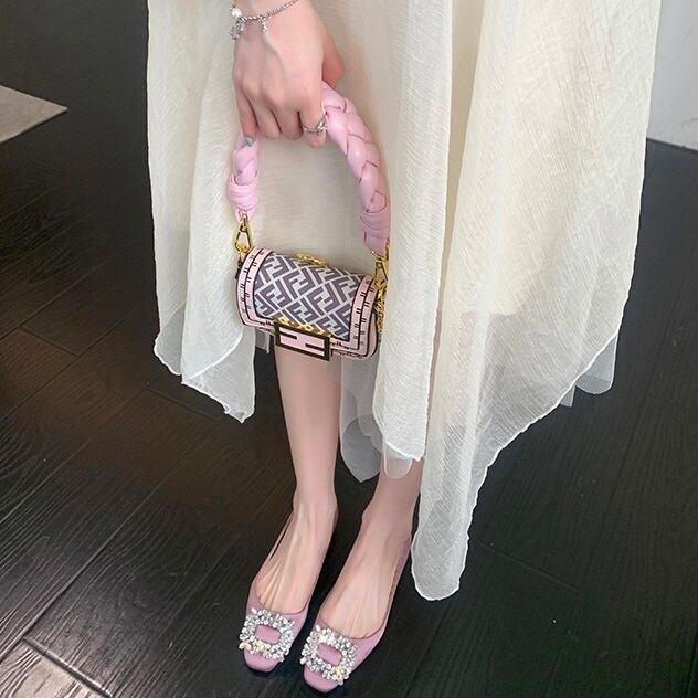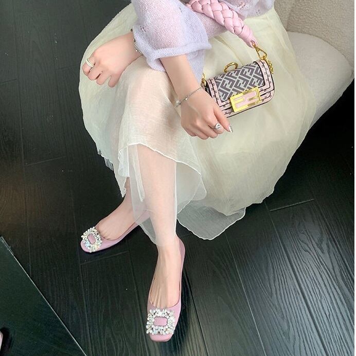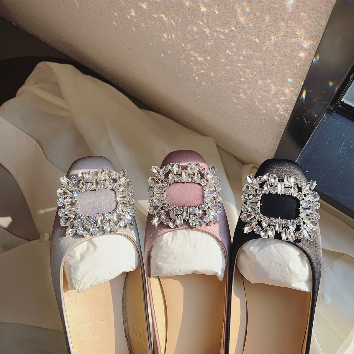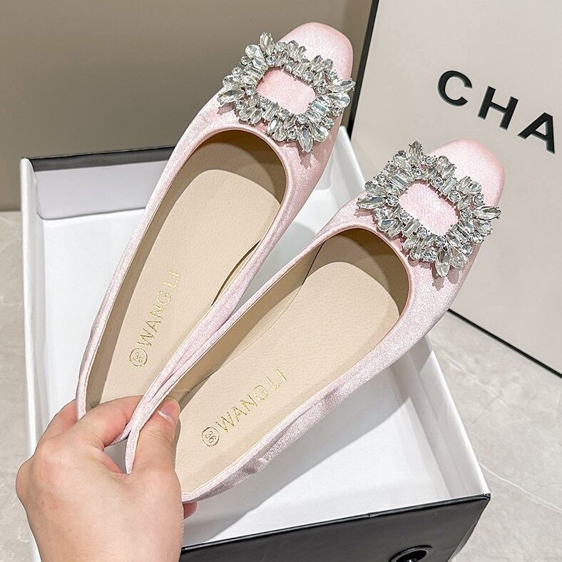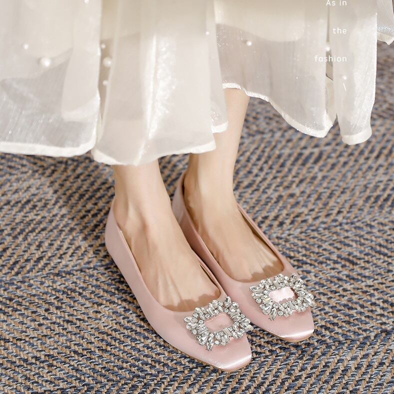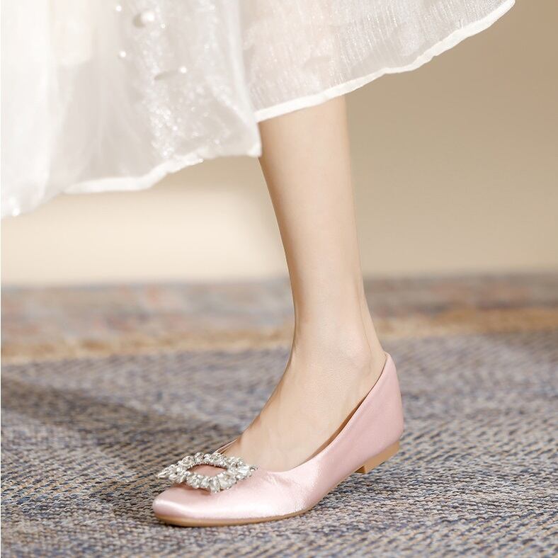キラキラのスクエアビジューがポイントのフラットパンプスです。クリアのスクエアビジューとサテン地の落ち着いた質感で、どんなスタイルも上品でフェミニンな印象に仕上がります。脚がきれいに見え、歩きやすいフラットソールです。ドレッシーなスタイルはもちろん、カジュアルなデニムスタイルもエレガントな雰囲気に仕上がります。
