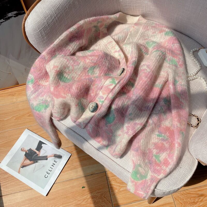 フローラルモチーフがフェミニンなニットカーディガンです。ピンク、グリーンのパステルカラーがミックスしたフローラル柄が楽しめます。ソフトな色づかいで、女性らしいやわらかさのあるスタイルに仕上がります。幅広いボトムスを引き立てる、スタイリッシュなデザインです。