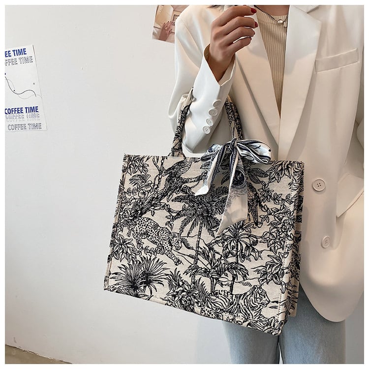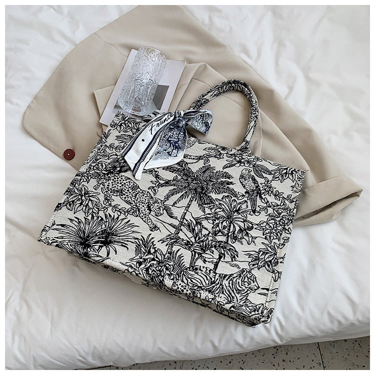 ジャングルをモチーフにしたリボンチャーム付きのジャカード素材のトートバッグです。ヒョウや植物などをモチーフにした美しい柄で、コーディネートをぐっとおしゃれに引き立てます。落ち着いたモノトーンですので、どんなスタイルにも合わせやすいデザインです。A4サイズの書類も入り、マチも広く、荷物の多い方にもおすすめの大きめサイズです。