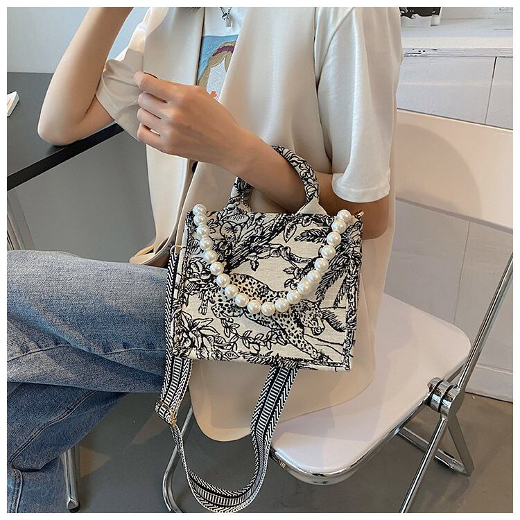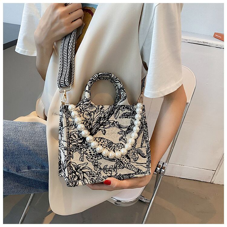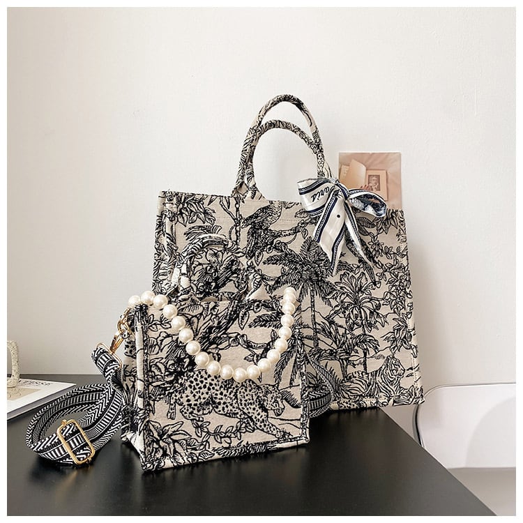 ジャングルをモチーフにしたジャカード素材のミニトートバッグです。ヒョウや植物などをモチーフにした美しい柄で、コーディネートをぐっとおしゃれに引き立てます。パールストラップがエレガントなアクセントになっています。落ち着いたモノトーンでどんなスタイルにも合わせやすいデザインです。